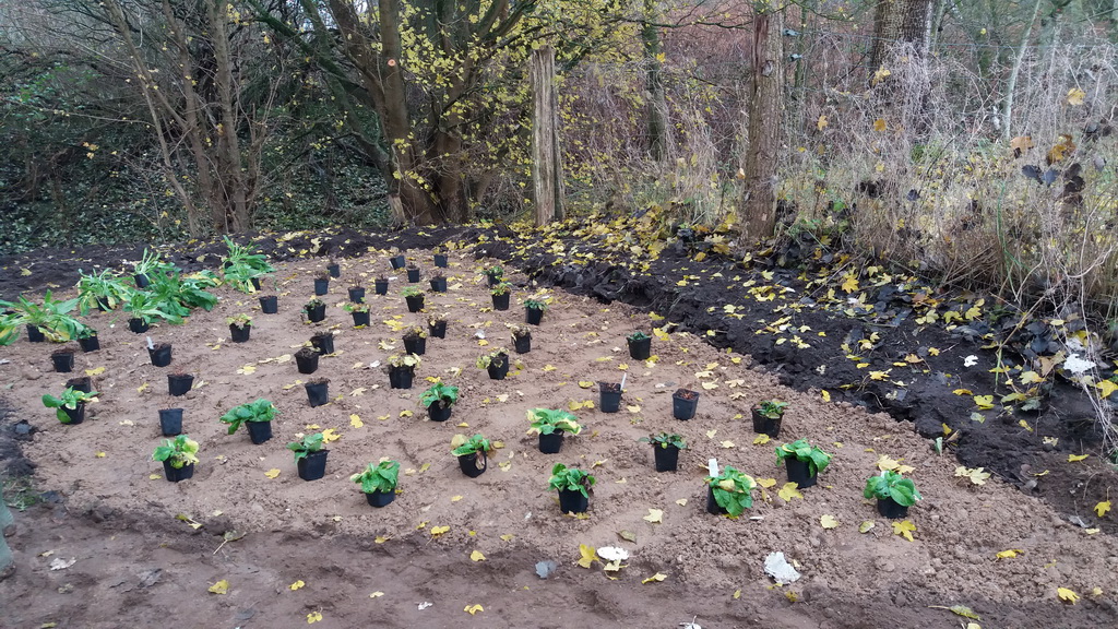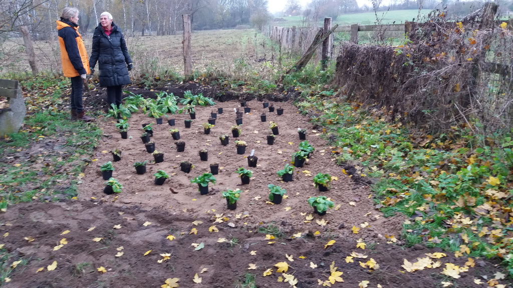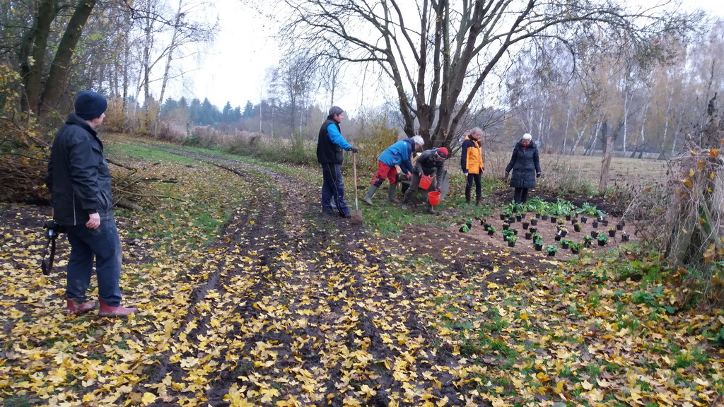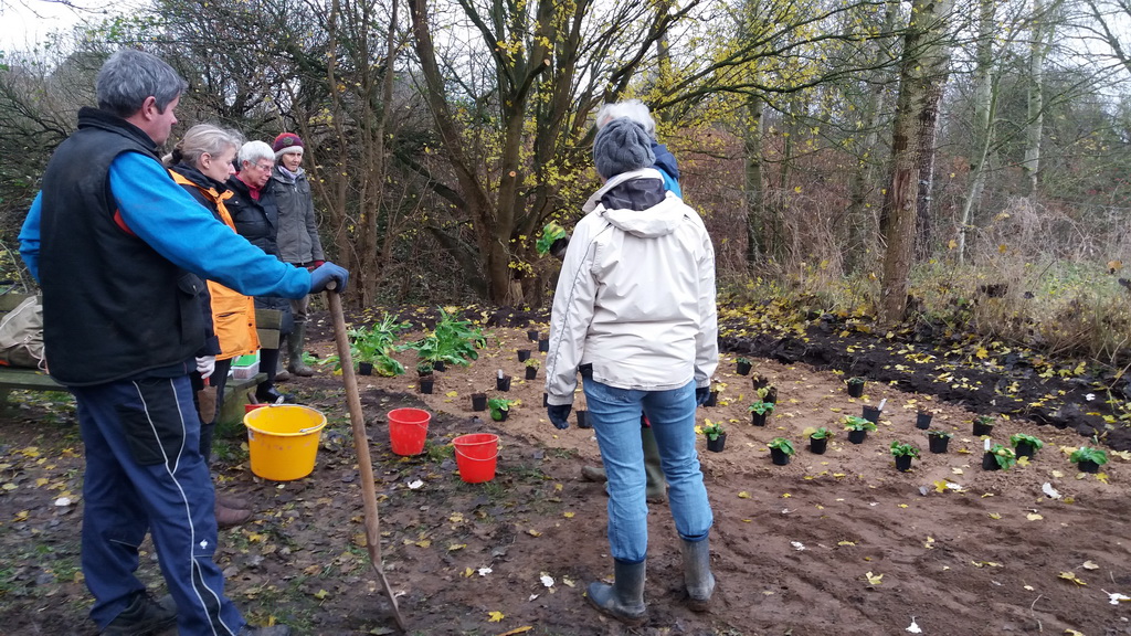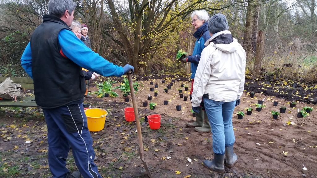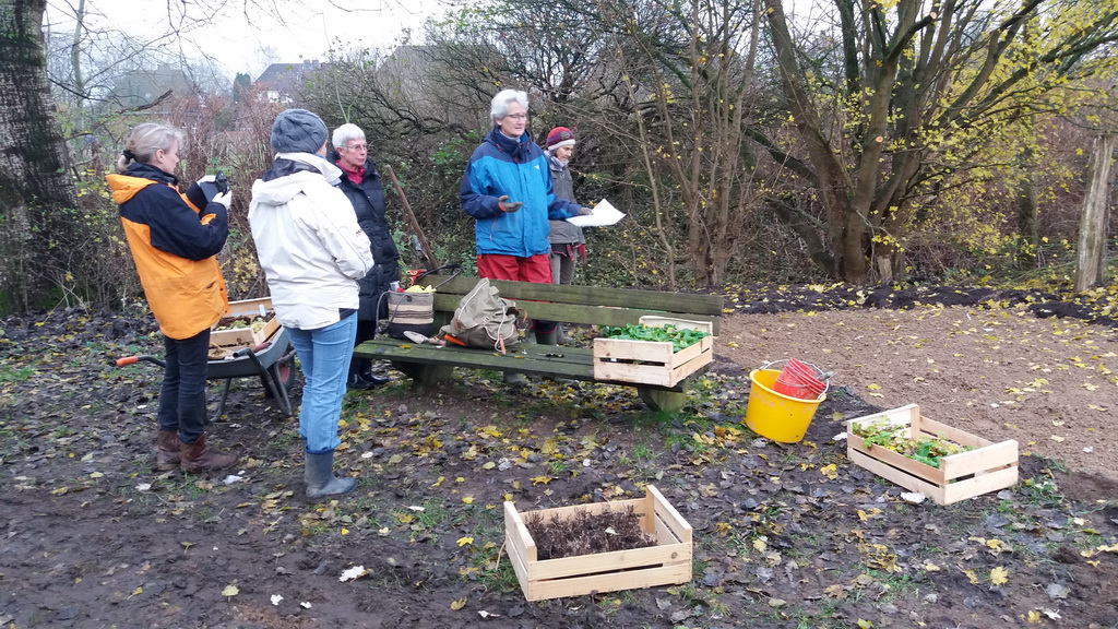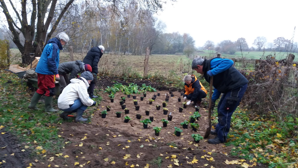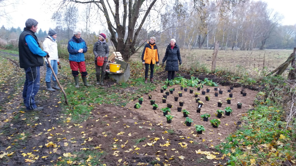 Projektbeschreibung Wildstaudenbeete am Wiesengrundweg: An dem Wanderweg „Wiesengrund“, der entlang der Steinau im Ort Nusse die Straße Klingenberg mit der Pantener Straße verbindet, sollten zwei Sitzplatzbereiche durch die Anlage von Wildpflanzenbeeten auf bisherigen Rasenflächen aufgewertet werden. Zur optischen Belebung und Förderung von Bienen und anderen Insekten wurde an einer eher schattig und an einer sonnig gelegenen Stelle je eine Fläche von ca. 10 m2 bzw. 14 m2 mit entsprechend ausgewählten Wildstauden bepflanzt. Dazu schob der Gemeindemitarbeiter für jedes Beet zunächst den oberen Bewuchs in einer Schichtdicke von 10 cm ab und füllte die entstandenen Mulden mit Wegekies. Zwischen den Beeten und den vorhandenen Weidezäunen blieb eine schmale Rasenmäherspur frei, um das Hinüberwachsen von Winde durch gelegentliche Mahd zu verhindern.In den Wegekies setzten Mitglieder der Nusser Gemeindeausschüsse für Wirtschaft, Umwelt und Zukunft und für Bau und Wege zusammen mit Mitgliedern des Arbeitskreises DorfGrün der Stecknitz-Region in einer gemeinsamen Pflanzaktion ca. 120 Stauden unterschiedlicher Arten. Dabei leitete sie die Landschaftsplanerin Frau Dr. Heinke Marxen-Drewes, die auch die Pflanzenauswahl getroffen hatte, fachkundig an. In den Beeten wachsen nun Nesselglockenblume, Nachtviole, Wasserdost, Wald-Frauenfarn, Mädesüß, Blutweiderich, kriechender Günsel, stengellose Schlüsselblume, Goldanemone und hohler Lerchensporn. Mit einer Ausrichtung auf blau-lila, rosa, weiß und gelb und unterschiedlichen Höhen und Blühzeiten werden diese mehrjährigen Pflanzen dem Wanderweg von Anfang März bis Ende September zwei farbenfrohe Hingucker verleihen.